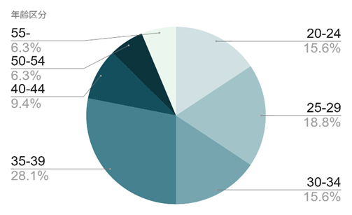 ララワークから転職した方で最も多いのが35~39歳。全体の約30%を占めています。ただ、20~34歳で約50%、40歳以上も約20%と、幅広い年齢層の方を支援してきました。