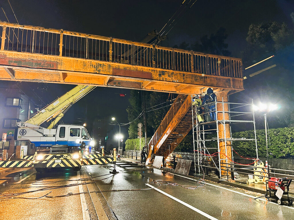 幾久公園(福井市)横に設置されていた歩道橋の撤去作業の様子。交通量の多い芦原街道沿いとあって工事時間帯は夜間、車を全面通行止めにして行なった。この他にも、全国各地のさまざまな橋梁補修工事に携わっている。