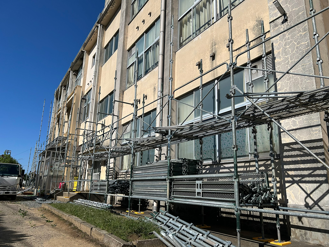 啓蒙小学校(福井市)の外壁補修工事の様子。この他にも、ハピリンの大屋根の組み立てや県内外の事業所・施設の鉄骨建方、足場仮設、建物の保護と長寿命化を目的とした塗装などの業務も行なっている。どの業務も高い技術と経験が不可欠である。