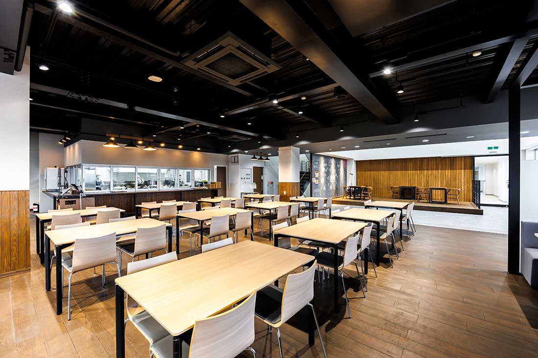 開放的な社員食堂など、社員の過ごしやすさに配慮した環境づくりを大切にしている。社是「常歩無限」が示す着実な歩みは、日々の何気ない場面に表れている。