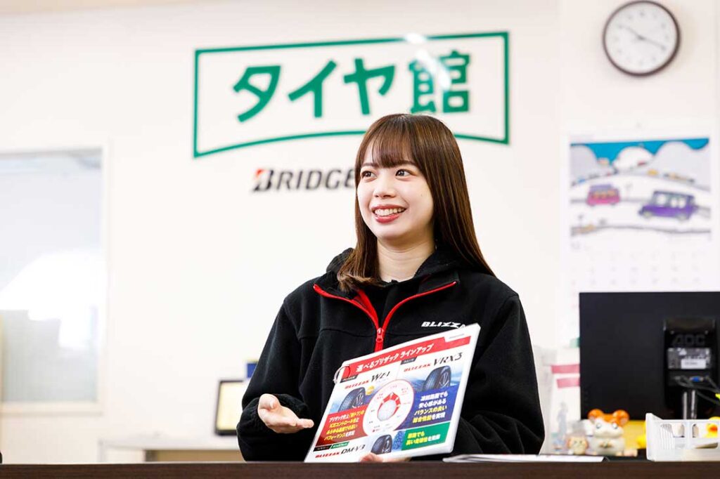 タイヤ業界は男性社会のイメージですが、女性も数多く活躍中! 定期的に研修や勉強会があるので、知識や経験が無くても安心して働けます。